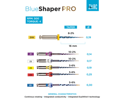 - Durabilitate și performanță ridicate - Oferă rezistență torsională mai mare la nivelul vârfului comparativ cu BlueShaper® clasic. Această rezistență crescută asigură durabilitate și fiabilitate superioare în procedurile endodontice, reducând riscul de fracturi sau deformări.