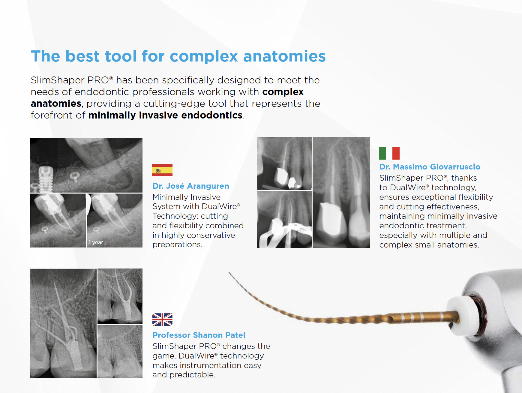 SlimShaper PRO® este un sistem de instrumentare endodontică minim invazivă, din gama PRO, care oferă echilibru între flexibilitate și eficiență de tăiere, folosind tehnologia DualWire®.
